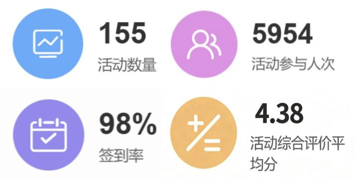 我校第二课堂本周活动量为155,活动参与人数为5954,活动的签到率达到98%,几乎全员参与,活动综合评价的平均分为4.38。