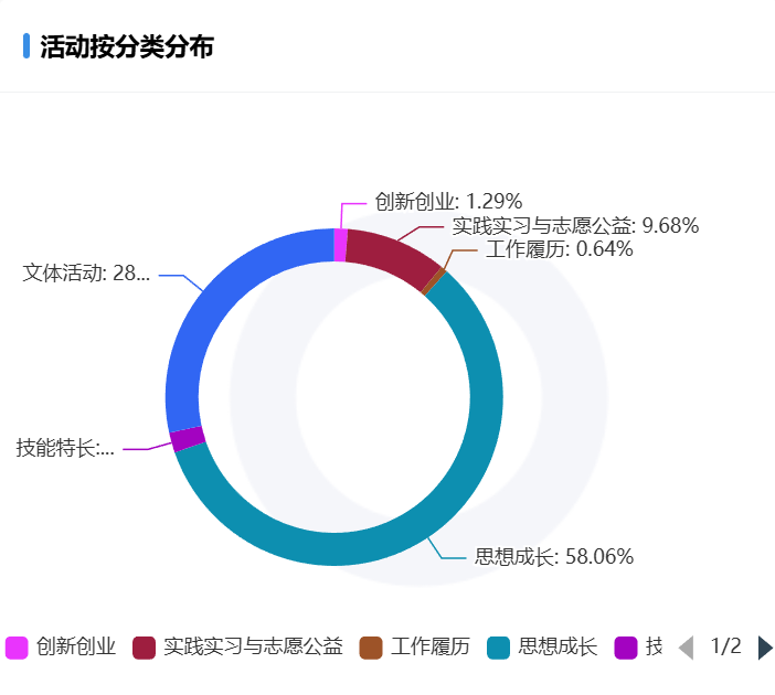 活动主要以思想成长类为首,其频率高达58.06%,其次是文体活动,实践实习与志愿公益也紧跟其后。