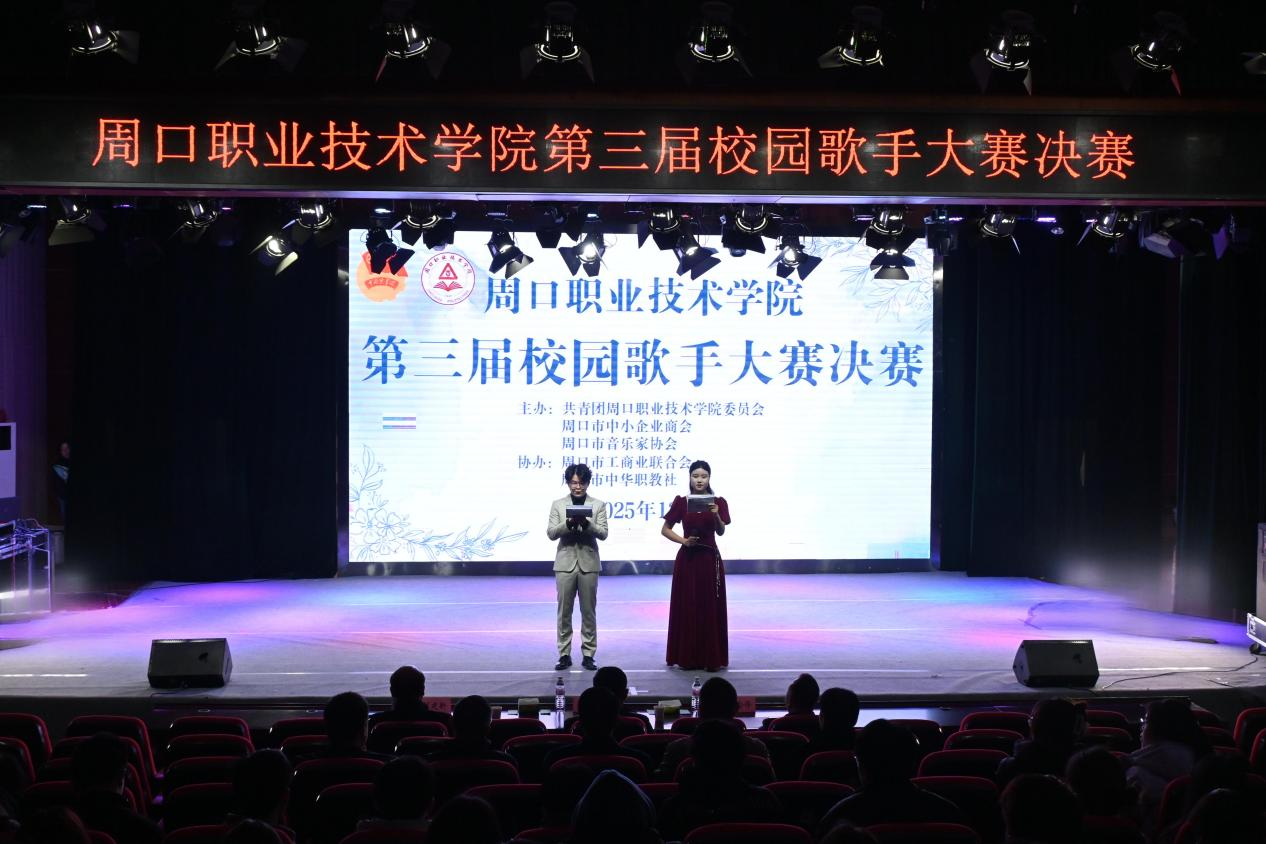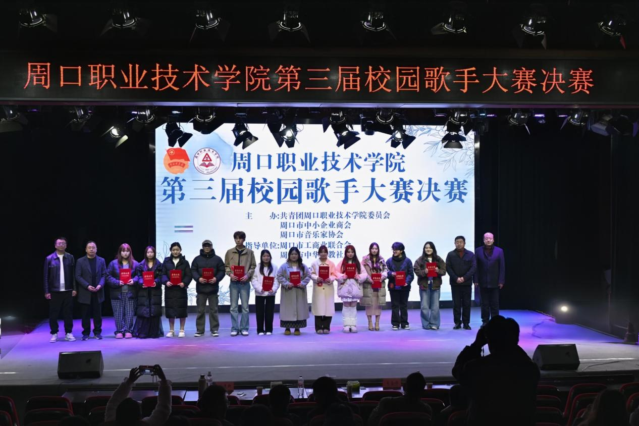 12月19日,周口职业技术学院第三届校园歌手大赛决赛在开元校区励德厅顺利举行,周口市工商联专职副主席杨超、周口职业技术学院党委副书记工会主席郭汝礼、周口市中小企业商会会长杨留峰、周口职业技术学院团委书记闻檑、周口职业技术学院艺术学院党总支书记王春生莅临比赛现场观看表演。三位评委老师分别是:周口市音乐家协会主席魏强、周口市音乐家协会副主席刘建新、企业代表肖金锋。