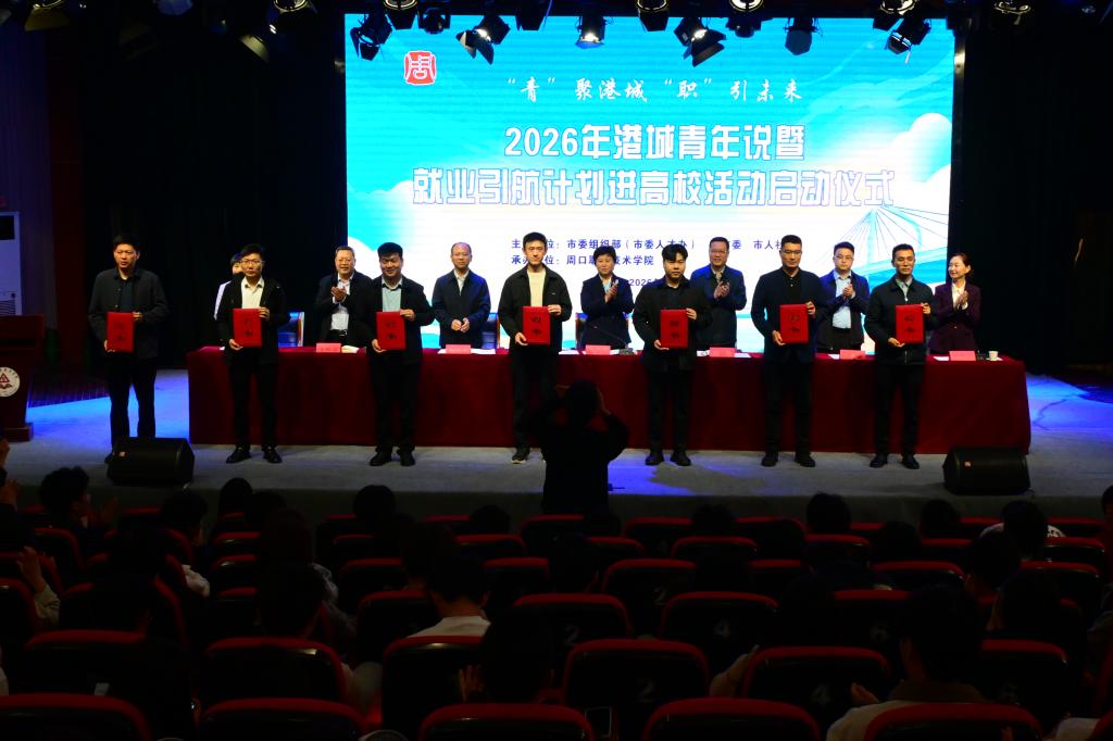 为深入学习贯彻习近平总书记关于青年工作、就业工作的重要论述,全面落实省委、省政府及市委、市政府关于高校毕业生就业创业工作部署要求,4 月 15 日下午,由市委组织部(市委人才办)、团市委、市人社局联合主办,周口职业技术学院承办的"青" 聚港城 "职" 引未来 ——2026 年港城青年说暨就业引航计划进高校活动启动仪式,在学校开元校区砺德厅隆重举行。